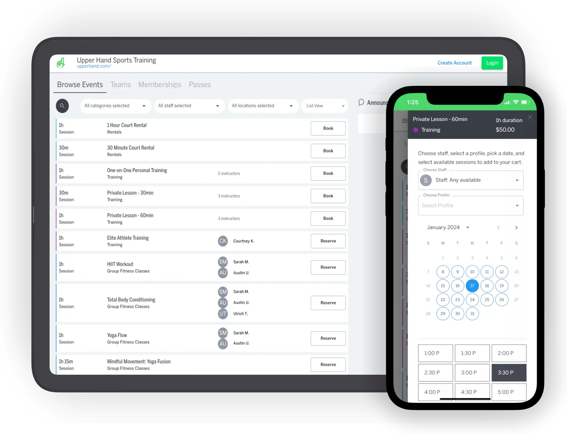 Manage your account through the upper hand app to view and reserve your spot in upcoming classes under the events tab.